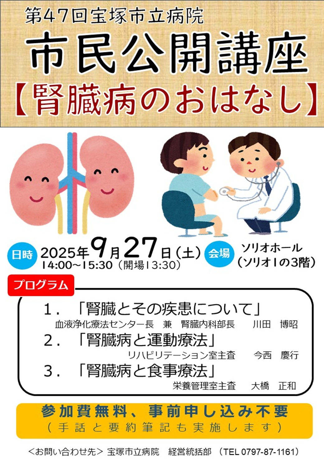 申込不要、参加無料。手話と要約筆記を実施します。 【講演1】腎臓病とその疾患について 宝塚市立病院 血液浄化療法センター長 兼 腎臓内科部長 川田 博昭 【講演2】腎臓病と運動療法 宝塚市立病院 リハビリテーション室主査 今西 慶行 【講演3】腎臓病と食事療法 宝塚市立病院 栄養管理室主査 大橋 正和 |