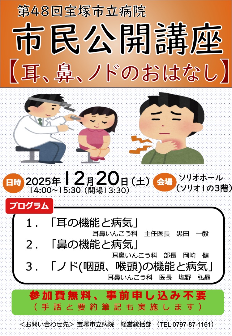 申込不要、参加無料。手話と要約筆記を実施します。 【講演1】耳の機能と病気 宝塚市立病院 耳鼻いんこう科 主任医長 黒田 一毅 【講演2】鼻の機能と病気 宝塚市立病院 耳鼻いんこう科 部長 岡崎 健 【講演3】ノド(咽頭、喉頭)の機能と病気 宝塚市立病院 耳鼻いんこう科 医長 塩野 弘晶 |